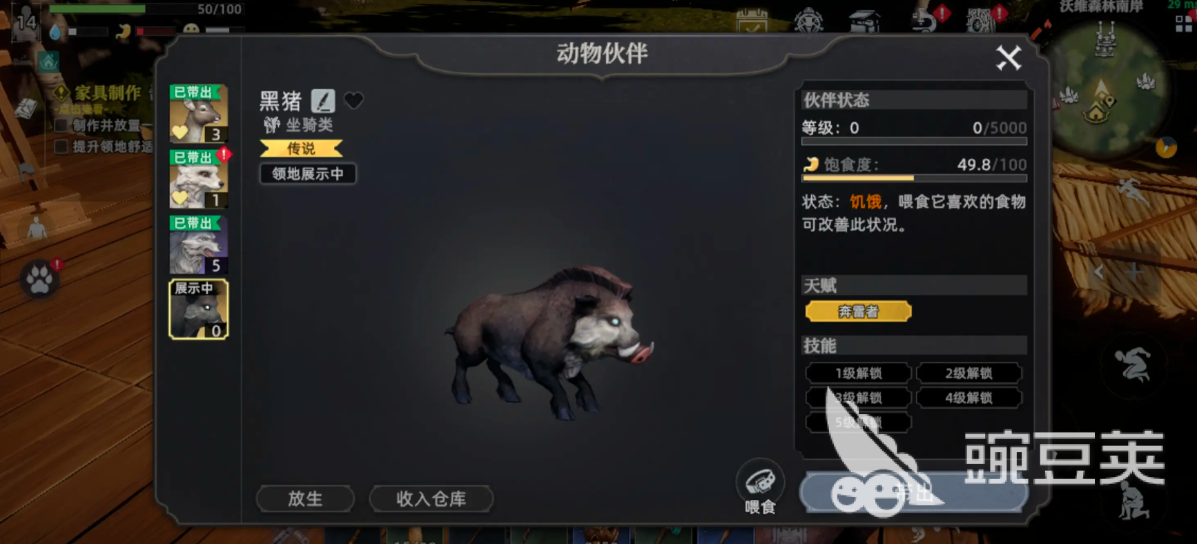 同時還需要注意,有些野豬會進(jìn)行變異,變異后的它會更加強(qiáng)大,一定要將其打到殘血狀態(tài),此時使用捕捉道具,就能更簡單的將其抓獲,這時候就成為自己的寵物了。此時就可以給野豬安裝鞍具,野豬是有沖撞和輔助技能的,可以騎乘它去采集資源,可沖撞巖體之類的。