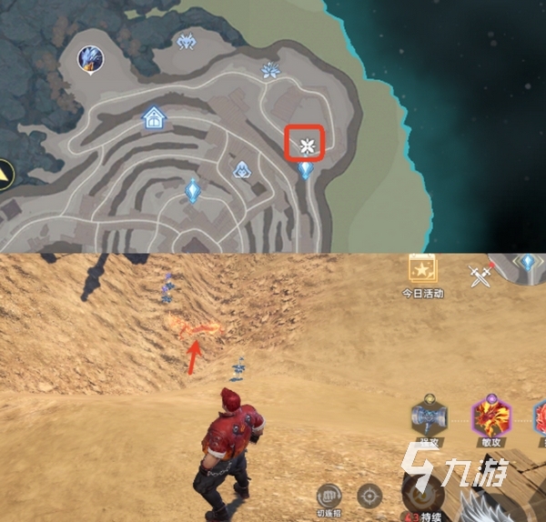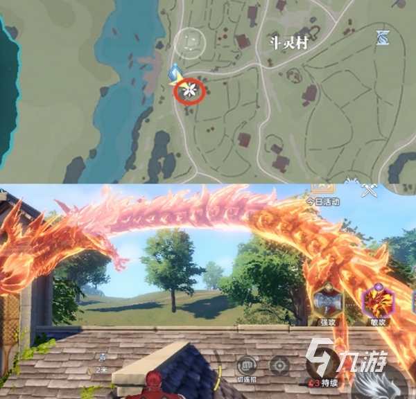 第五處碎片在斗靈村附近房屋的屋頂上。傳送至斗靈村后,向前略微探索,即可在某棟民居頂部發(fā)現(xiàn)火龍回憶點。這個碎片很顯眼,是六個碎片中最容易找到的。
