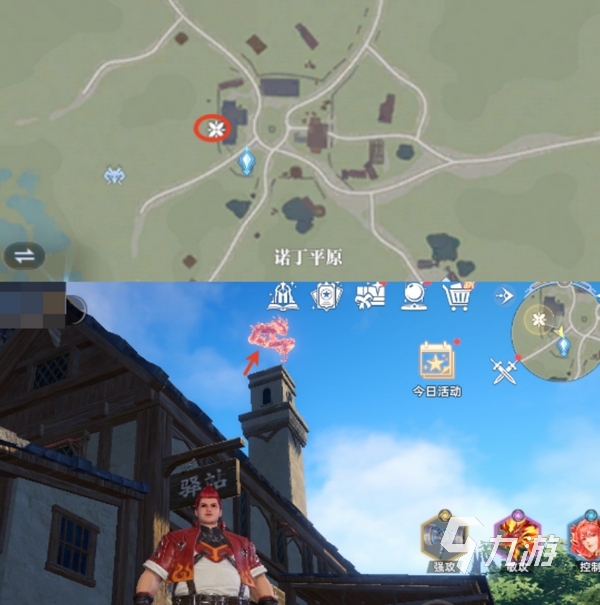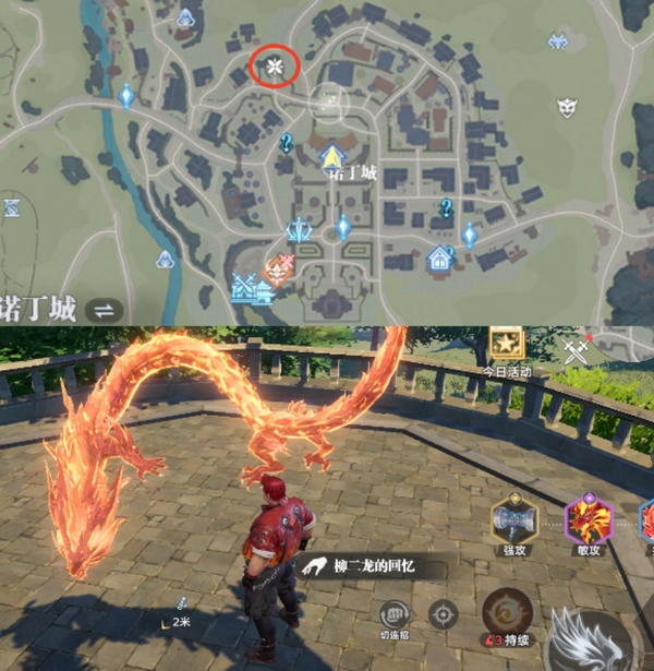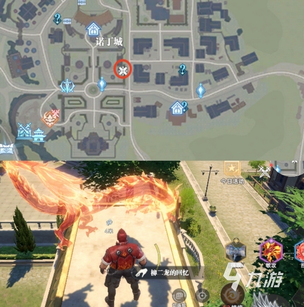 第一個回憶碎片是在諾丁城主城左上角的圓臺區(qū)域??拷鼒A形高臺時會看到一個火龍標記,走近后即可進行互動收集。可以參照圖中圈出來的地方,整個區(qū)域地勢開闊,還是很容易抵達的。