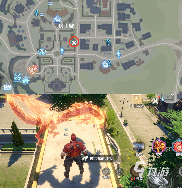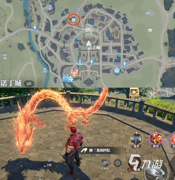 柳二龍的回憶碎片一共有6個(gè),第一個(gè)是在諾丁城主城的左上角,如圖所示可以看到一處圓臺(tái),這里用花圖案給大家標(biāo)記了,靠近后可以看到有一條火龍靠近互動(dòng)就可以收集這個(gè)回憶。