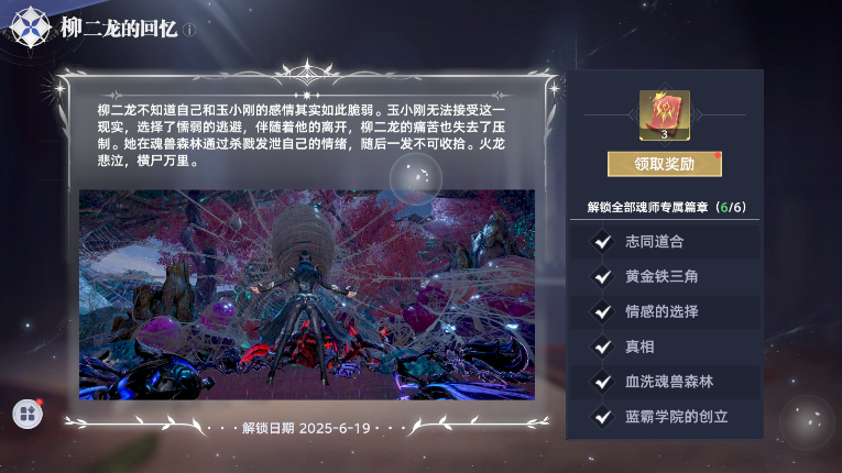 至此斗羅大陸獵魂世界魂師篇章探索之柳二龍篇就結(jié)束了,收集這6個(gè)回憶之就可以在設(shè)置-魂師篇章中解鎖柳二龍回憶的名字,6個(gè)回憶全部解鎖就可以獲得武魂覺(jué)醒券獎(jiǎng)勵(lì)了。