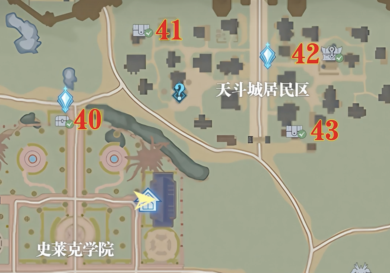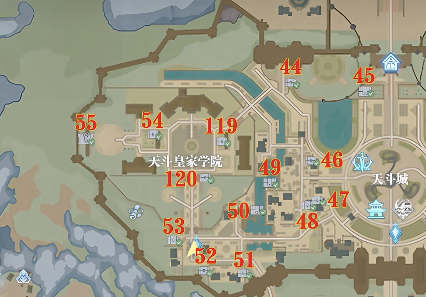 接著來到天斗城,以城中的雕像為界,在左邊的天斗皇家學(xué)院,具體的寶箱如下。