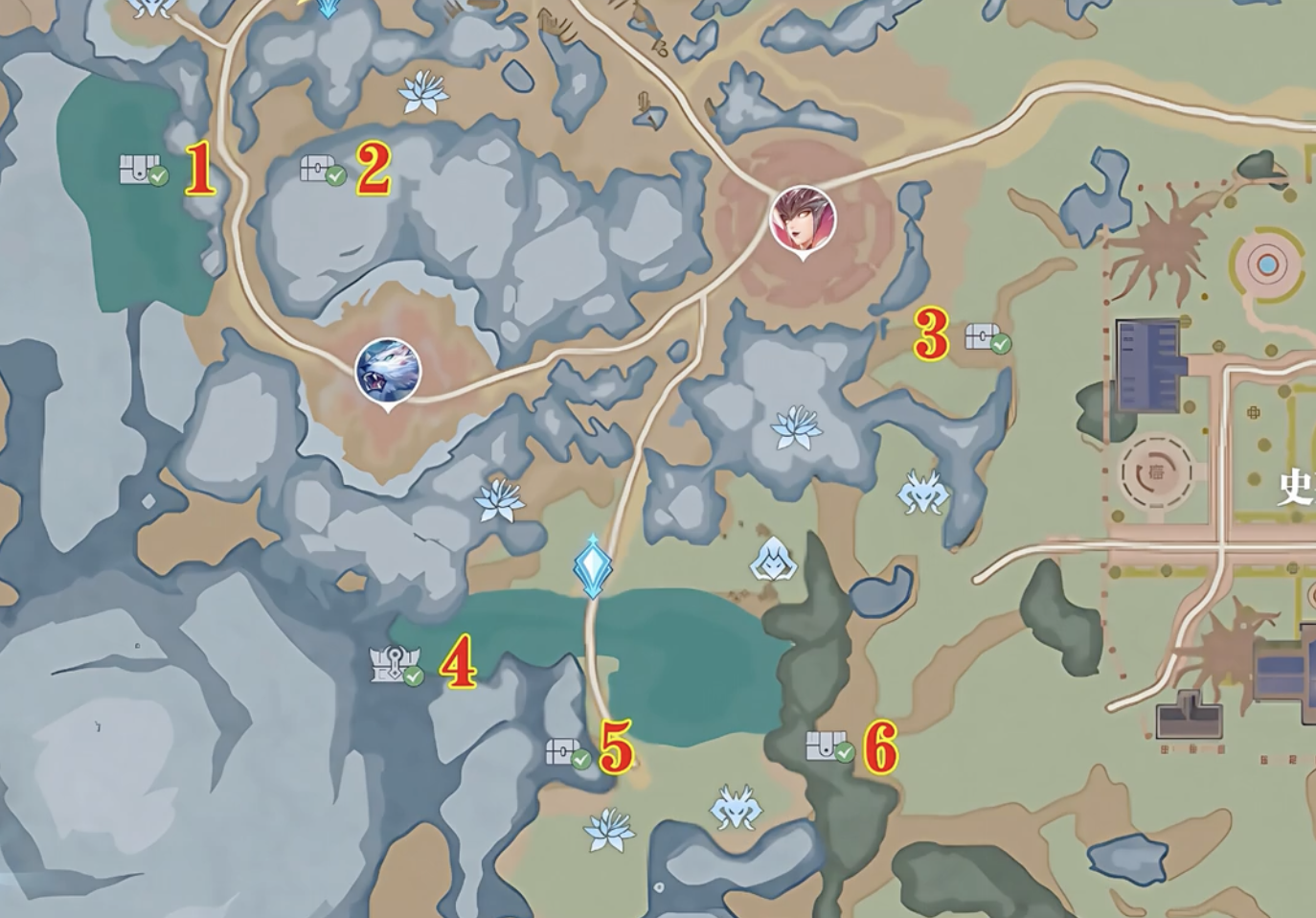 山區(qū)部分的寶箱就這么多了,接著我們到中心的平原地圖,史萊克學(xué)院附近,這里寶箱比較分散,總共有5個。