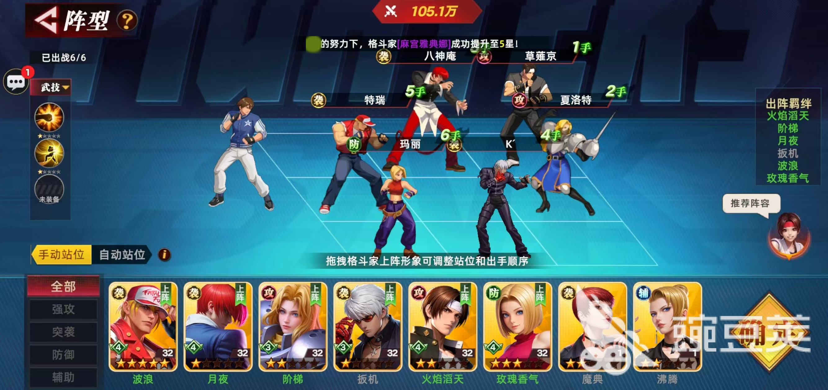 全明星覺(jué)醒中角色被按照自身的特點(diǎn)進(jìn)行劃分,分為了攻、防、襲、輔這四大分類(lèi),小編推薦角色時(shí)也是按照這四類(lèi)來(lái)進(jìn)行分別介紹。首先是攻,這一類(lèi)角色是屬于游戲中的群體輸出擔(dān)當(dāng),比較推薦的角色是草薙京和夏洛特。草薙京是經(jīng)典拳皇角色,技能可以對(duì)敵方全體造成高額傷害,還可以施加燃燒效果,讓敵方在后續(xù)的回合內(nèi)持續(xù)掉血。夏洛特則是擁有華麗的連招,在群體中能造成大量傷害,是團(tuán)隊(duì)輸出的核心力量。