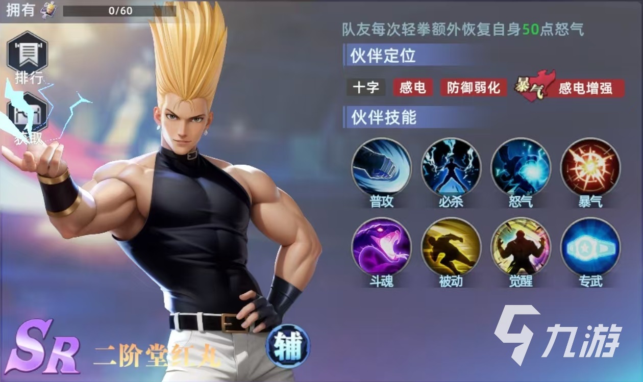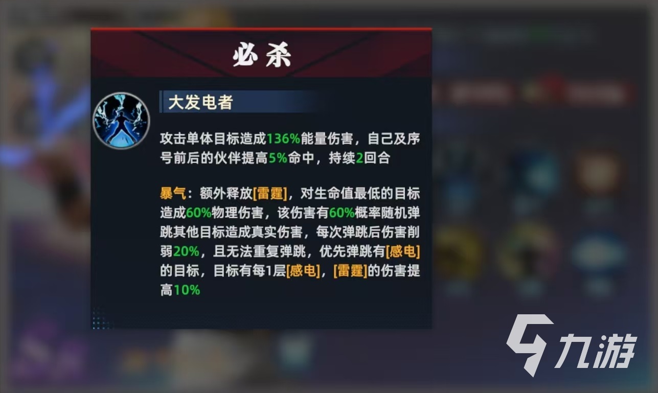 在實戰(zhàn)中,隊友每次打出輕拳攻擊,都可以額外恢復二階堂紅丸50點怒氣。當自身獲得一次重拳后觸發(fā)暴氣,對敵方全體有30%的幾率造成一層感電效果。必殺技攻擊單體目標,造成能量傷害,自身及序號前后的伙伴,都能提高5%命中,持續(xù)兩個回合。在爆氣的狀態(tài)下,會額外釋放雷霆,對敵方生命值最低的目標造成傷害,還有幾率隨機進行彈跳,優(yōu)先選擇帶有感電的目標來進行彈跳。
