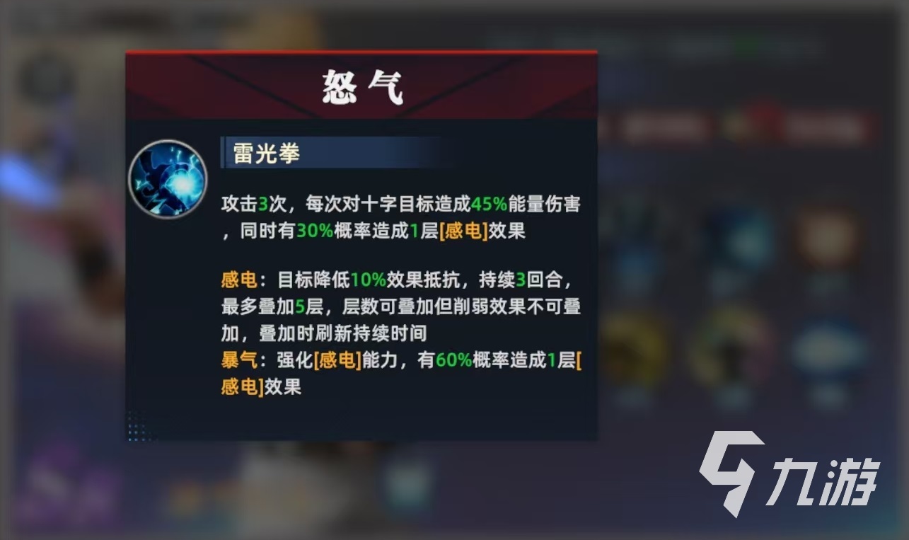 怒氣技直接攻擊三次,每次對十字目標造成能量傷害,有30%幾率造成一層感電效果。對方被感電所影響之后,會降低10%效果抵抗能力,持續(xù)三回合,最多能疊加到5層,層數(shù)雖然可疊加,但是削弱效果不疊加。在爆氣的強化下,會提升感電能力,造成感電的幾率更高。在覺醒之后,對處于感電的敵方目標,會降低對方的最終免傷。這樣就當于削弱了對方的防御,使我方可以打出更高的傷害,這就是二階堂紅丸這個輔助的核心所在。