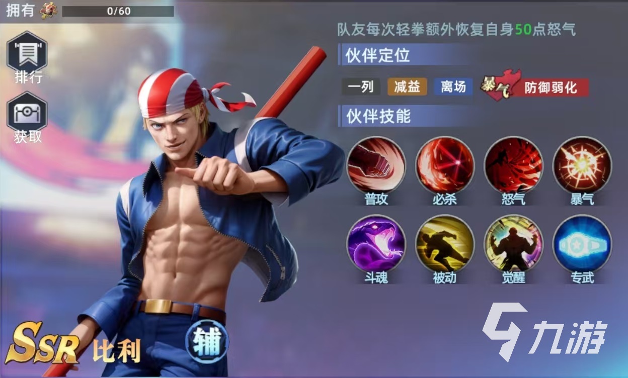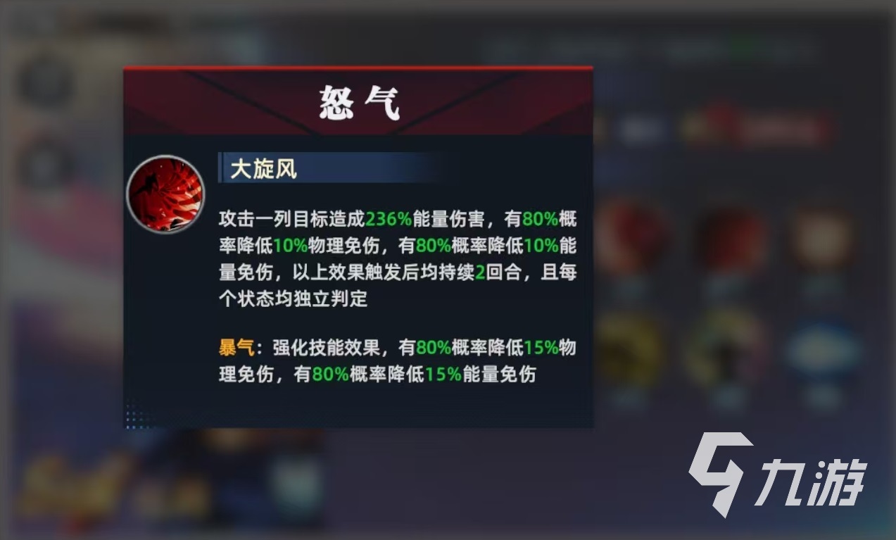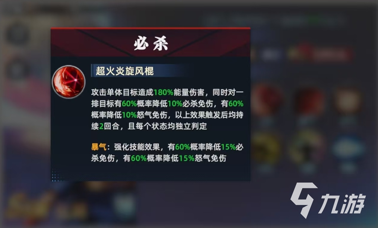 在技能方面,比利的爆氣是釋放一次重拳后可以觸發(fā),提升自身20%的效果命中,持續(xù)三回合。必殺效果是攻擊單體目標(biāo),造成能量傷害,同時(shí)對(duì)一排目標(biāo)有60%幾率降低其必殺免傷屬性,有60%幾率降低怒氣免傷屬性。以上效果是獨(dú)立判斷的,觸發(fā)之后均能夠持續(xù)兩個(gè)回合。在爆氣的強(qiáng)化下,觸發(fā)幾率不變,但降低的效果提升。