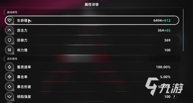 接下來看進(jìn)階屬性,“蓄質(zhì)速度”可以理解為大招的充能?!皟A陷強(qiáng)度”這個屬性可看成屬性的異常效果,在戰(zhàn)斗時想必大家都發(fā)現(xiàn)了,敵方的血條下面還有個進(jìn)度條,這個條代表的就是敵方的“傾陷值”,大家在攻擊敵人時,這個條的進(jìn)度就會增長,如果是觸發(fā)了極限閃避再攻擊敵人,傾陷值就會增長更快;