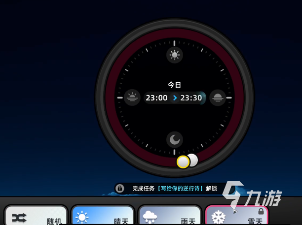 首先大家屏幕右滑出菜單,找到并點擊“時鐘圖標”后,能進入到天氣和時間的調整界面,在這里能看到晴天、雨天和雪天的選項,但是雪天卻是鎖定狀態(tài),點擊會顯示需要完成“寫給你的逆行詩任務”。