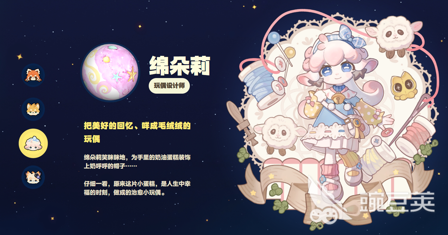第2個伊佐奇,伊佐奇的職業(yè)是斗蟲訓(xùn)練師,他模型是淺黃色狐貍,以此為原型打造,造型身穿綠色運動裝,經(jīng)常帶著一個捕蟲網(wǎng),性格積極樂觀,時刻準備捕捉稀有的甲蟲,對這項活動充滿熱情。第3個棉朵莉,她的職業(yè)是玩偶設(shè)計師,是一個采用粉色系小羊形象打造出的擬人角色。在性格方面溫柔細膩,擅長的是將生活中的回憶,轉(zhuǎn)化成可愛的毛絨玩具。