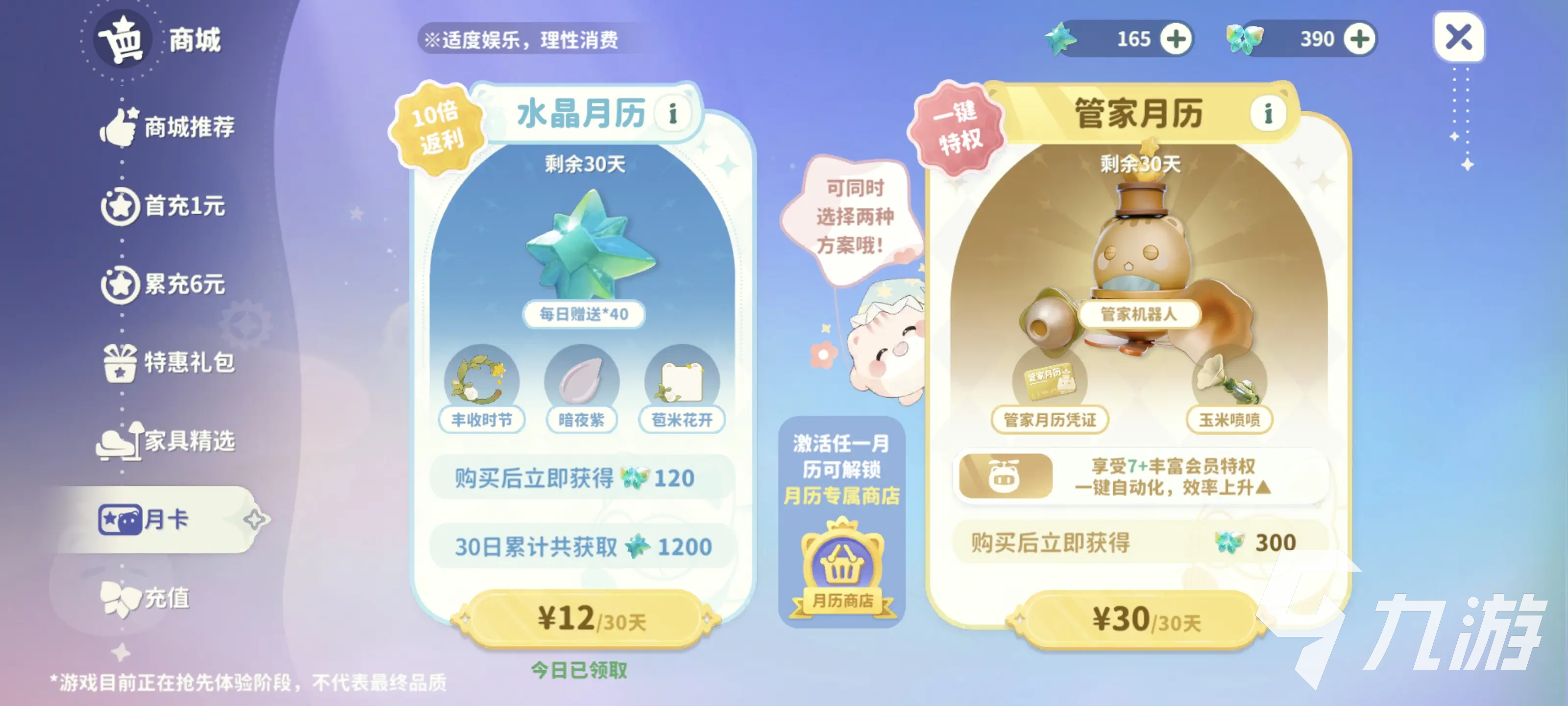 接下來就是比較經(jīng)典的月卡,也就是水晶月歷和管家月歷,這是兩個不同檔位的月卡,售價分別是12和30元,水晶月歷購買后能立刻獲得120個夢想水晶,每日可領(lǐng)取40個澄空水晶,還有其他多樣的獎勵每日都能領(lǐng)取。