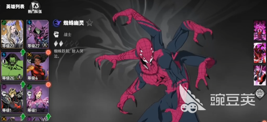 第二個選擇蜘蛛幽靈,這是高爆發(fā)的近戰(zhàn)輸出英雄,對于單體,或者BOSS具有較好的克制作用,每損失4%生命值,就能觸發(fā)一次閃避提升效果,被動的觸發(fā)頻率是比較高的;1技能對對手和相鄰單位造成物理損傷;