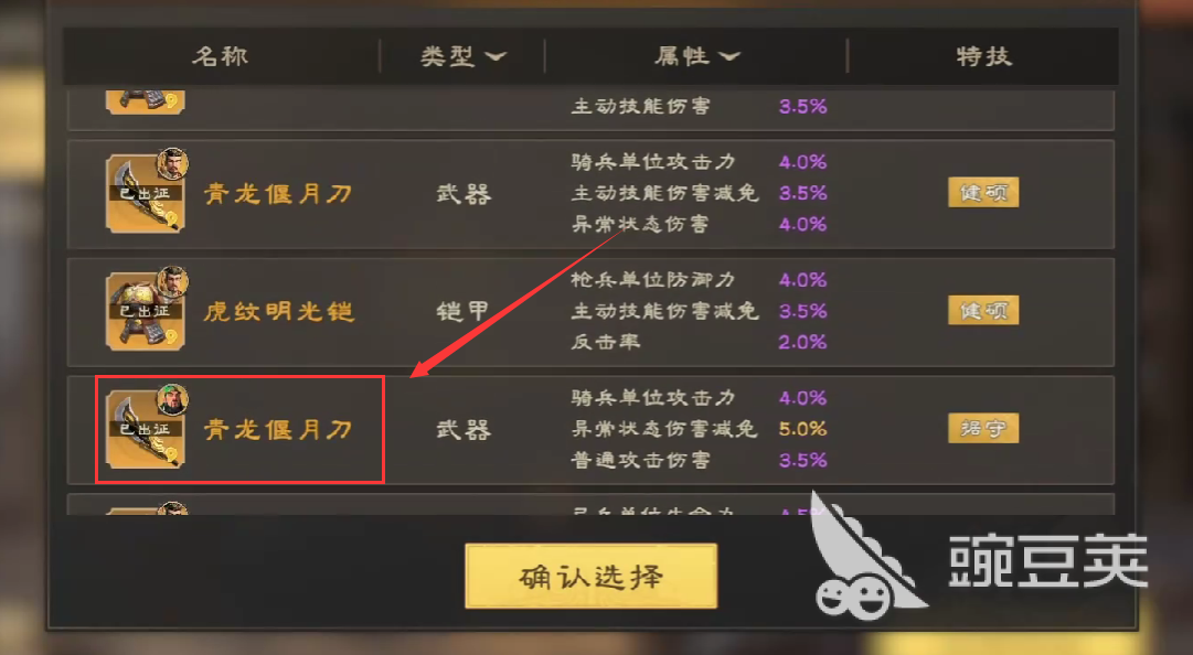 青龍偃月刀在游戲內,是一個金色屬性的武器,它可以提升騎兵單位的攻擊力,同時附加主動技能傷害減免,以及異常狀態(tài)的傷害效果,由于它的屬性是金色屬性,所以在詞條的獲取上,玩家是不會獲取紫色屬性,以下的各類屬性的,其中青龍偃月刀的單體異常狀態(tài)傷害減免屬性最高為5%,騎兵單位的攻擊力最高也為5%。