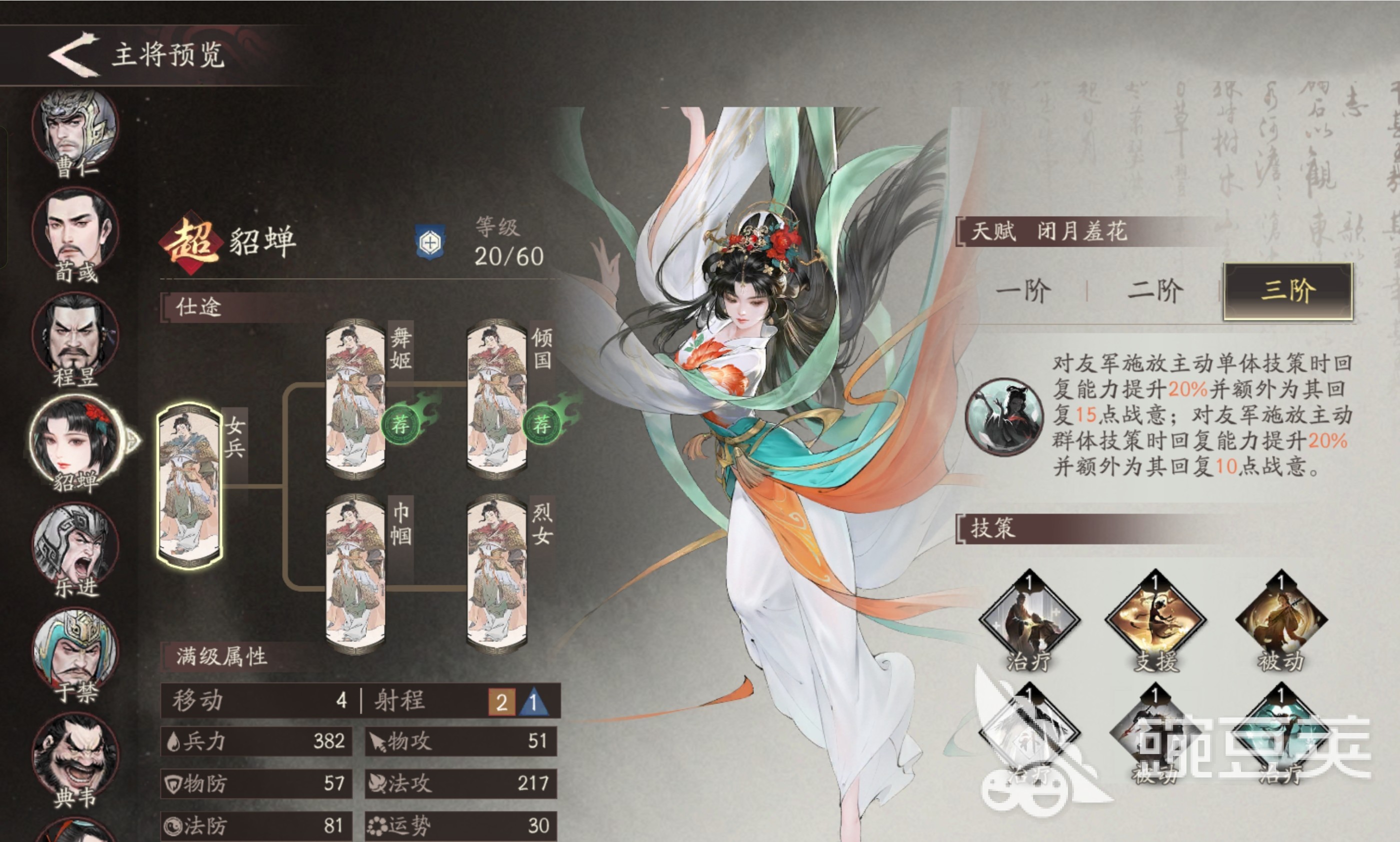 她的分支優(yōu)先選【傾國】,避免選【烈女】,后者兵種被動(dòng)與貂蟬技能【玲瓏】效果重復(fù),無法疊加收益,浪費(fèi)分支優(yōu)勢(shì)。最后推薦必帶技能:【翩若驚鴻】+【沉魚落雁】+【玲瓏】