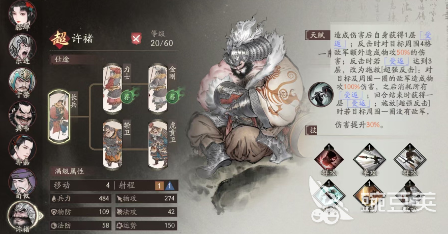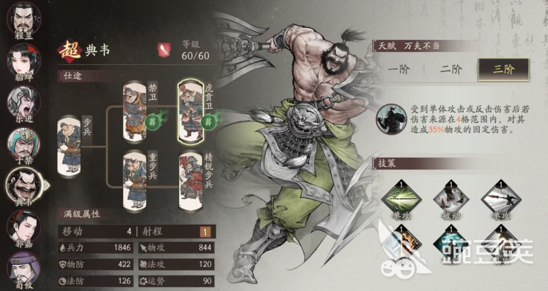 長槍兵是以陣型見長,具有克制騎兵保護(hù)友軍和對敵方增益驅(qū)散等特點(diǎn),代表主將是許褚,能夠很好的保護(hù)隊友。許褚是屬于反擊流的代表英雄,反擊傷害和主動攻擊的敵人數(shù)量相關(guān),攻擊到的敵人數(shù)量越多,疊加的層數(shù)也就越高,自然傷害也就越高。疊加三層更是有額外效果,在坦度方面甚至要超過夏侯敦。步兵系是目前防御性最強(qiáng)的兵種,能夠嘲諷敵方,擁有高防肉盾等特點(diǎn),能克制長槍兵,代表主將是典韋,能夠為主隊友分擔(dān)傷害,提供減傷增益。其實整個步兵系武將使用起來都非常簡單,尤其是典韋,典韋的被動就是反擊,加上對反擊來進(jìn)行反擊,偏向于純粹的狂戰(zhàn)士,很適合在原地和對方互砍。自身的技能在受到單體攻擊或者是反擊傷害后,如果傷害來源在距離四格范圍之內(nèi),可對其造成固定傷害,這樣無論是對方的肉盾還是輸出,對抗典韋都很頭疼。