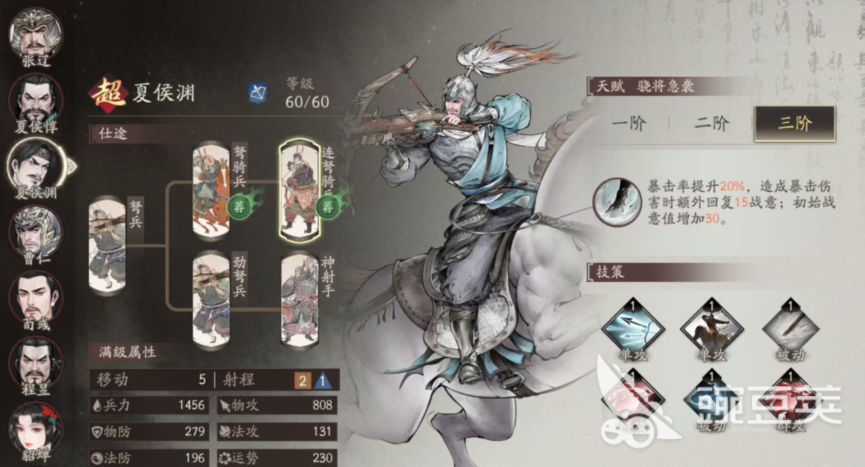 弓兵系是遠(yuǎn)程火力的代表,能進(jìn)行精準(zhǔn)射擊和持續(xù)輸出,在較遠(yuǎn)的地方對敵方重要目標(biāo)進(jìn)行精確打擊,代表武將是夏侯淵。夏侯淵擁有非常強(qiáng)的遠(yuǎn)程單體爆發(fā)和高移動特點(diǎn),自身的核心機(jī)制在于提升暴擊率和暴擊恢復(fù)怒氣,注重單體爆發(fā)的夏侯淵,其實并不需要更大的攻擊范圍,兩個分支的被動技能都非常強(qiáng),在前期資源不夠的情況下性價比很高。