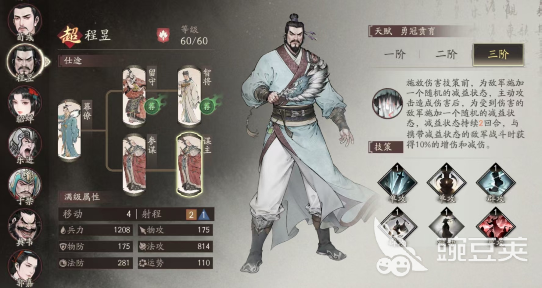 策士指的就是智力比較高的謀士類型武將,其中代表型的武將是郭嘉和程昱。郭嘉是屬于典型的謀士類型,擁有極強(qiáng)的法攻屬性,達(dá)到了全游戲最高,雖然自身比較脆,但是作為一尊純法玻璃大炮,只要用好之后輸出是非常高的。郭嘉在戰(zhàn)斗中可以選擇射程更遠(yuǎn)的軍祭酒,利用天賦距離越遠(yuǎn)傷害和效果越高的優(yōu)勢打出更強(qiáng)的效果。程昱雖然是屬于策士類型,但是自身卻非常獨(dú)特,天賦可以在攻擊之后為敵方附加隨機(jī)的buff,使用技能之后,能附加額外的buff,并且對有擁有不良狀態(tài)的敵人,附加增傷和減傷。和其他策士不同的是,程昱往往走的是比較肉的路線,將自身的法攻數(shù)值轉(zhuǎn)換成雙防,自身身板運(yùn)用輸出越高。