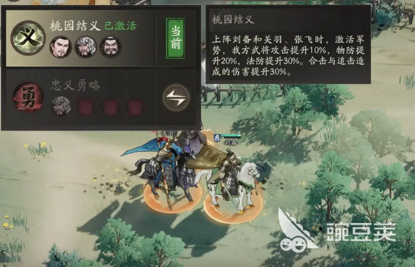 某些將領(lǐng)之間是存在著羈絆關(guān)系的,你也可以根據(jù)這個(gè)來決定本場(chǎng)上場(chǎng)的配置。如果你是一名新手玩家的話,那么小編最推薦的配置就是劉關(guān)張,這個(gè)配置無論是輸出、坦克還是治療都是比較齊全的,并且可觸發(fā)羈絆關(guān)系桃園結(jié)義,己方所有武將的攻擊力提升10%,物理防御提升20%,法術(shù)防御提升30%。如果成功對(duì)敵人造成合擊或追擊,則造成的傷害提升30%。新手玩家需要面對(duì)的大部分副本都可以通過這個(gè)配置來解決,其余的兩個(gè)位置大家可以根據(jù)自己手中現(xiàn)有的角色來進(jìn)行安排。