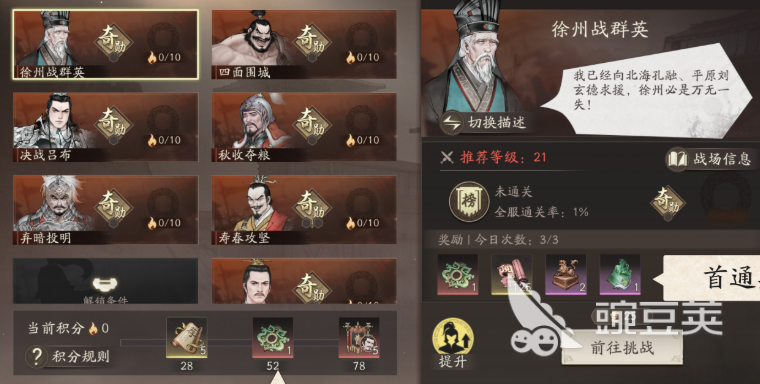 第二關(guān)的話大家參與的時(shí)候會(huì)有一個(gè)徐州車輪戰(zhàn)的玩法,而且在其中大家也可以在真實(shí)章節(jié)里面獲取一些打法上面的技巧,這里比實(shí)際章節(jié)的級(jí)別要難一些,大家可以選擇一些比較強(qiáng)力的武將來參與,這里的車輪戰(zhàn)主要選擇3種主要類型的裝甲士兵一起上陣就可以了,通過步兵還有騎兵的能力結(jié)合起來,達(dá)成遠(yuǎn)近交替的輸出效果,這樣得到的大范圍支持也是可以去打持久戰(zhàn)的。