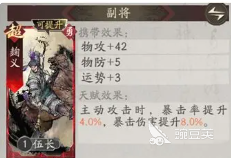 所以在前期大家如果為夏侯淵配上裝備的話,攻擊力有提升效果的就可以,前期能夠適合夏侯淵主要效果的還是比較少,大家看情況搭配額外的就是還是靠副將的提升帶來(lái)足夠的能力,因?yàn)橄暮顪Y核心是暴擊,所以在副將上面大家選擇一些基礎(chǔ)屬性,或者是天賦上面跟暴擊有關(guān)的,也是可以跟夏侯淵進(jìn)行搭配的,這里大家可以選擇武安國(guó)或者是麹義,武安國(guó)他雖然是一張藍(lán)色品質(zhì)的武將卡,但是基礎(chǔ)屬性上面是比較契合夏侯淵的能力,而且在獲取上面新手是完全不用擔(dān)心的,可以作為一個(gè)過(guò)渡的附加來(lái)進(jìn)行使用。