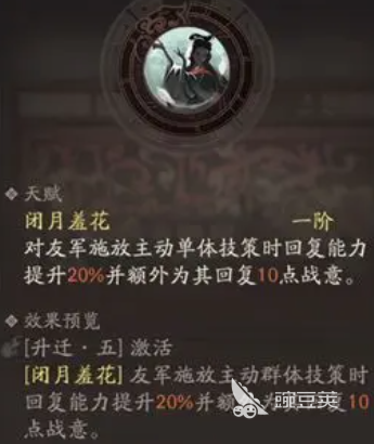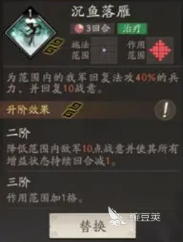 然后沉魚落雁這個技能,如果貂蟬沒有達到5星的情況下,其實是不用帶這個技能的,因為沉魚落雁主要是在貂蟬達到5級之后才會有更好用的效果,這里觸發(fā)不了天賦效果的話,她的強度自然就會減少一些,而且是這個技能的冷卻時間是比較長的,帶來的回血量比較一般,但最主要的能力就是回戰(zhàn),恢復(fù)的戰(zhàn)意能力,所以升級之后降低敵方的戰(zhàn)意數(shù)值也可以帶來一部分的影響,這類效果后期在作用范圍上面還可以加一個,所以這個技能如果貂蟬達到五星的話,就是一定要帶的一個技能。