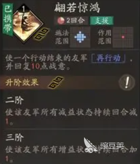 它在基礎(chǔ)一階的情況下,帶來技能的釋放效果是可以在單體釋放計策的時候,給角色提升20%的提升能力,而且在戰(zhàn)意恢復(fù)上面也會有10點的恢復(fù)數(shù)值,所以對于輔助后期來說,她這樣的能力是不用著急的,后期她也有雙單奶帶一個被動的帶法,所以她的技能只要升級到五星,其實效果就非常強,而核心技能上面叫做翩若驚鴻,這個技能其實主要是給友軍帶來一個再動一次的回合,那么這個技能在額外的能力上面,也是為角色換帶來10點戰(zhàn)意上面的恢復(fù)升級以后,在挑戰(zhàn)的回合上面還可以讓她的增益得到一個回合的升級,而且后期再帶來控制效果的時候,會讓敵人后期減少一個回合的再行動能力,所以這個技能屬于是貂蟬的必帶技能。