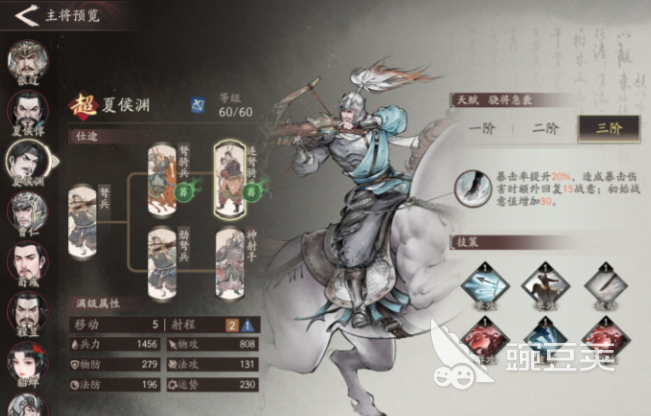 如果小伙伴們的手中比較缺遠(yuǎn)程輸出型的角色,那么小編比較推薦的是夏侯淵,當(dāng)升到二階之后,他能夠?yàn)殛?duì)伍帶來15%的暴擊率加成,如果說你平時(shí)比較喜歡玩弓兵體系,那么夏侯淵絕對(duì)是一個(gè)必須要培養(yǎng)的角色,而如果說你手中的角色大多比較脆皮,急需一個(gè)治療的話,那么夏侯淳就是你的首選了,升至二階之后,它可以在殘血狀態(tài)下恢復(fù)32%的兵力。