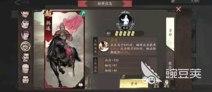那么在初始的情況下,大家攜帶一名的情況下面也可以找到一個更適合大家使用的副將,一般情況下還想要給一個主將帶來兩個副將的搭配效果,大家就要盡快把自己的等級提升到42級,此時副將就可以為主將提供大量的屬性加成,以及特殊類型的技能效果,那么此時整體的這種效果才會有超強的能力,后期副將其實跟主將一樣也是可以進行培養(yǎng)的,在副將界面上面,大家還可以看到目前所有副將他們的能力是什么,以及在此界面上副將一樣可以進行等級提升以及復原操作。