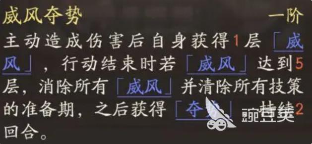 首先為大家推薦他的天賦威風(fēng)奪勢(shì),這個(gè)技能可以主動(dòng)造成傷害,然后此時(shí)他可以給自身帶來(lái)一層威風(fēng)狀態(tài),在這個(gè)行動(dòng)結(jié)束的時(shí)候,如果自身的威風(fēng)狀態(tài)達(dá)到5層的情況下,他還可以消除自身所有的威風(fēng),然后清除自己所有的計(jì)策準(zhǔn)備期之后再獲得奪勢(shì),這個(gè)奪勢(shì)狀態(tài)就相當(dāng)于一個(gè)增益的狀態(tài),可以持續(xù)兩個(gè)回合,這里提到的威風(fēng),其實(shí)是可以給他帶來(lái)物攻提升3%,然后上線5層的一個(gè)數(shù)值,而奪勢(shì)的話,帶來(lái)的增益效果更高一些,同時(shí)造成的傷害數(shù)值可以提升15%,而在受到的傷害數(shù)值上面可以降低15%,另外它還可以通過威風(fēng)奪勢(shì)來(lái)激活升遷的能力,也就是說,在行動(dòng)結(jié)束時(shí),如果他身上的威風(fēng)狀態(tài)達(dá)到了五層的話,那么此時(shí)對(duì)一圈范圍內(nèi)的敵軍,他還可以帶來(lái)物攻50%的傷害。
