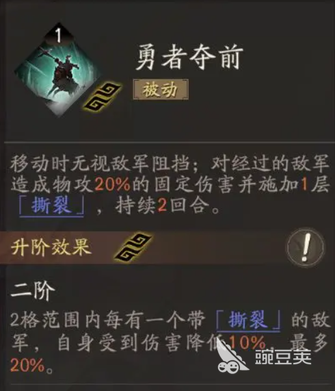 第3個(gè)技能叫做勇者奪前,這個(gè)技能只屬于一個(gè)被動(dòng)的技能,張遼在移動(dòng)的時(shí)候利用這個(gè)技能可以直接無(wú)視敵人的阻擋,并且對(duì)于目前經(jīng)過的敵人來(lái)說,還可以造成物攻20%的固定傷害。此時(shí)還可以增加另外的一層撕裂影響給敵人,這個(gè)撕裂影響也是會(huì)持續(xù)兩個(gè)回合生效的,目前這個(gè)效果相對(duì)來(lái)說就是一個(gè)非常優(yōu)質(zhì)的被動(dòng)能力,只要他移動(dòng)的時(shí)候能夠穿越目標(biāo)手段的話,這里得到一級(jí)就可以增加穿過敵人數(shù)量的威風(fēng)層數(shù),而撕裂效果可以直接無(wú)視對(duì)面的防御值結(jié)算這里帶來(lái)的物攻,所以真實(shí)傷害非常高,放在實(shí)戰(zhàn)里面也是有非常強(qiáng)大的能力。