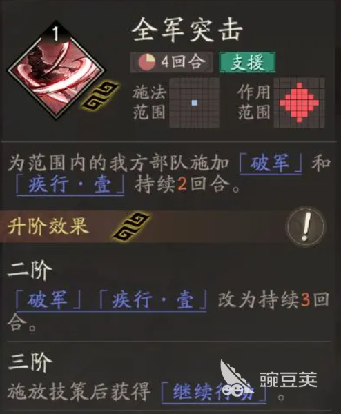 并且再一次增加一層撕裂,這個(gè)撕裂的效果是可以降低他自身15%的兵力恢復(fù),在回合結(jié)束的時(shí)候,受到釋放者物攻20%的傷害時(shí),達(dá)到的上限可以施加到5層,他另外的一個(gè)技能上面是有一個(gè)全軍突擊的效果,這個(gè)技能可以給范圍內(nèi)的我方部隊(duì)全部都是加破軍的能力,以及這里還有畸形的兩個(gè)回合增益可以釋放給敵人,破軍在這里的效果就是代表,大家使用張遼進(jìn)行主動(dòng)攻擊的時(shí)候,他自身的傷害數(shù)值可以根據(jù)破軍的生效來(lái)提升15%,然后是在移動(dòng)力上面有一點(diǎn)加成,但是這個(gè)效果是不可以進(jìn)行疊層的,而且還可以被對(duì)對(duì)面的凈化技能給清除。