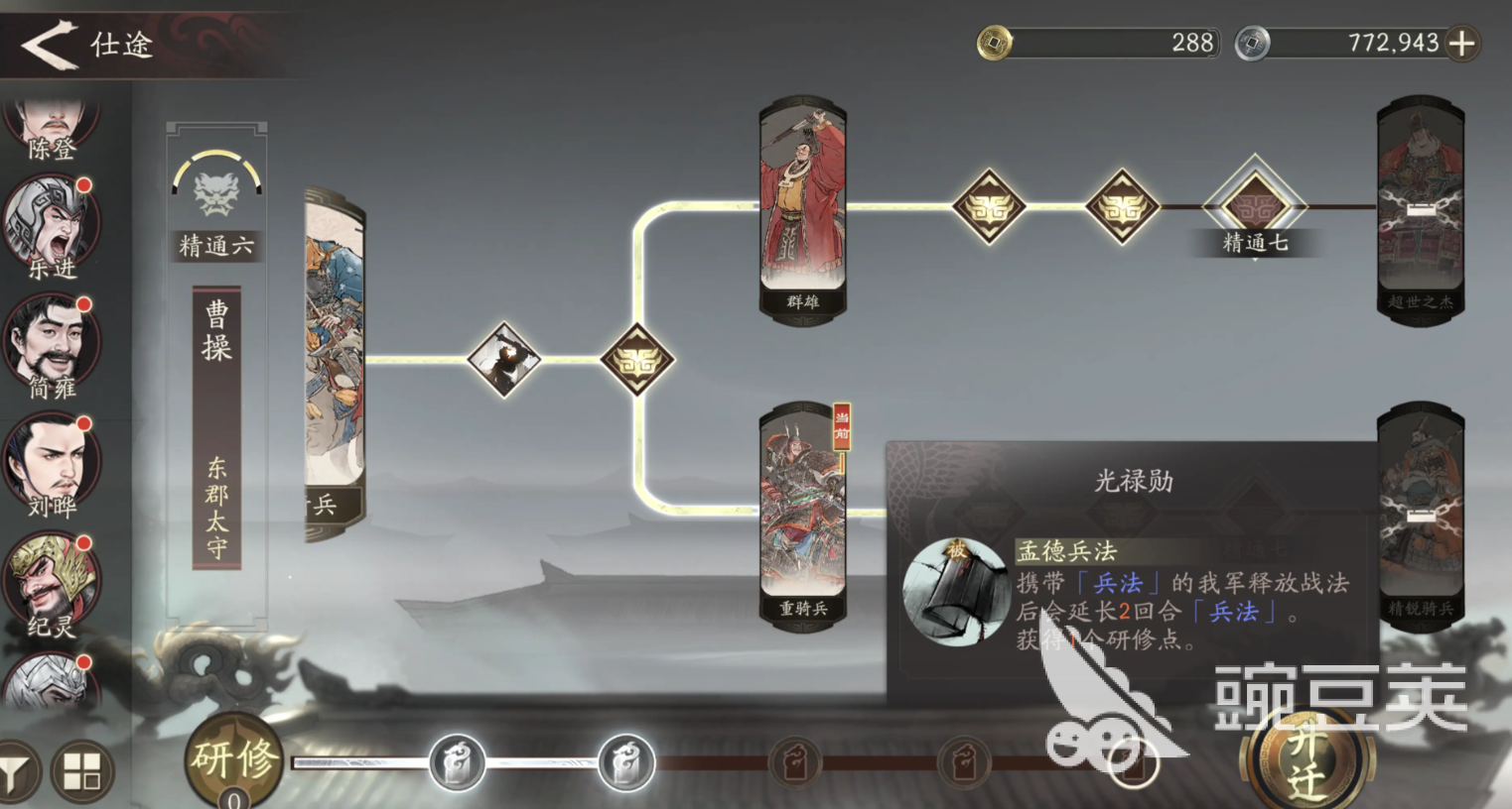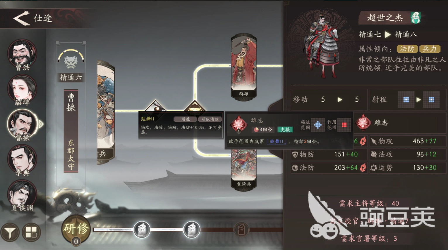 養(yǎng)曹操建議2條仕途線都解鎖激活,因?yàn)樵鲆婕即蠖嗳盒劬€,光環(huán)技在重騎兵線,這些都比較關(guān)鍵,全部獲得后因?yàn)橹荒軒?個(gè)技策上陣,所以推薦帶2個(gè)增益、1個(gè)光環(huán)來(lái)主打輔助,如揮鞭、雄志加天下的搭配就很不錯(cuò)。