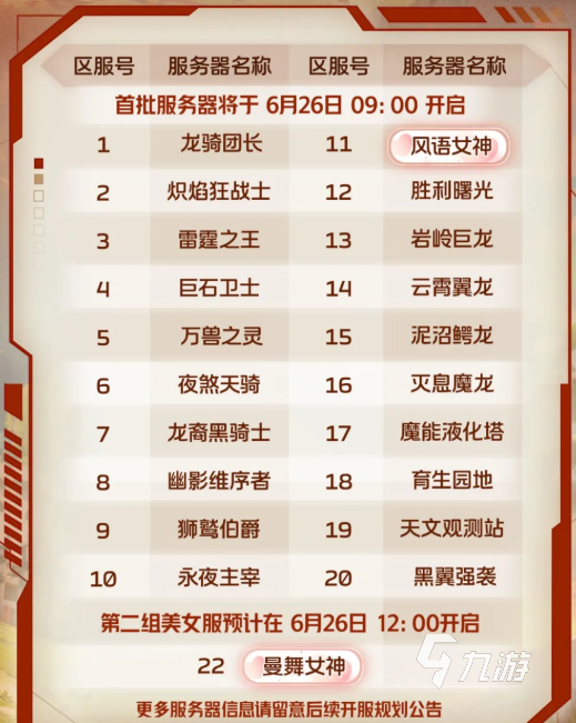 如圖所示,游戲公測是6月26日,而首批服務(wù)器開啟是在當(dāng)天上午的9點,第一批一共有20個,其中11服和后續(xù)12點開啟的22服都是美女服,有主播入駐對應(yīng)服務(wù)器,如果有喜歡的主播可以考慮去對應(yīng)服。