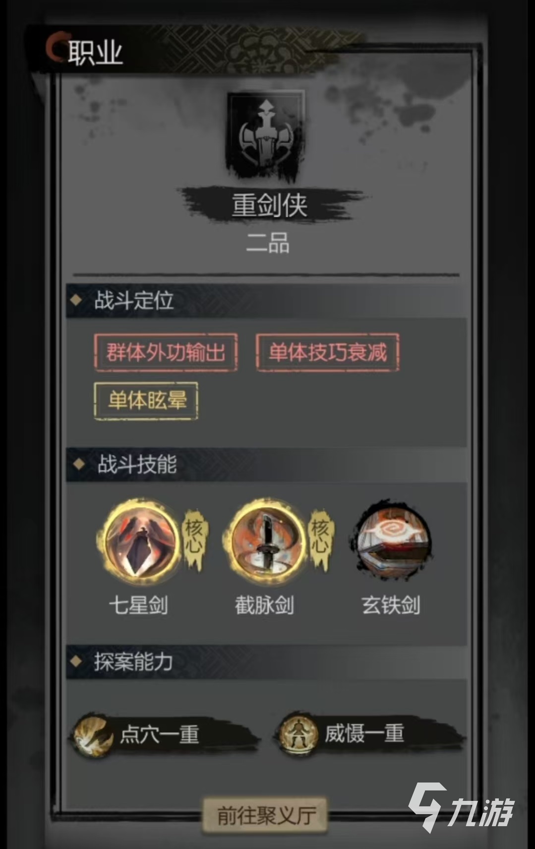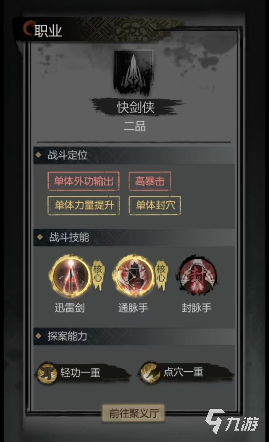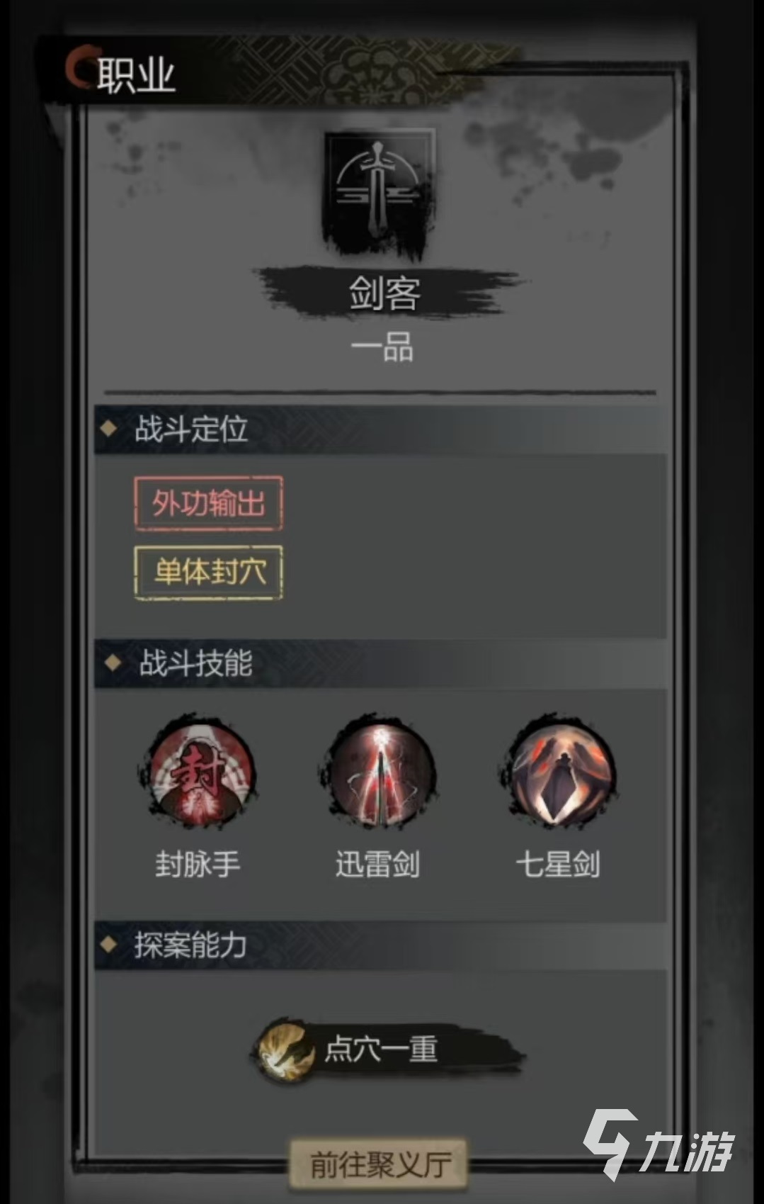 迅雷劍是屬于單體外功傷害類型,可對敵方造成與力量和技巧相關(guān)的外功傷害,如果目標(biāo)處于外防衰減狀態(tài)下,有機率使本次的傷害提升。力士、猛士和鐵衛(wèi)這三個職業(yè),都可以對敵方造成外防衰減狀態(tài),所以他們都是劍客非常好的搭檔。七星劍的效果是對敵方全體造成外功傷害。通過技能可以看出劍客是一個輸出非常強勢的職業(yè),所以非常適合大家在陣容中選擇后續(xù)的兩個轉(zhuǎn)職方向,分別是快劍俠和重劍俠。