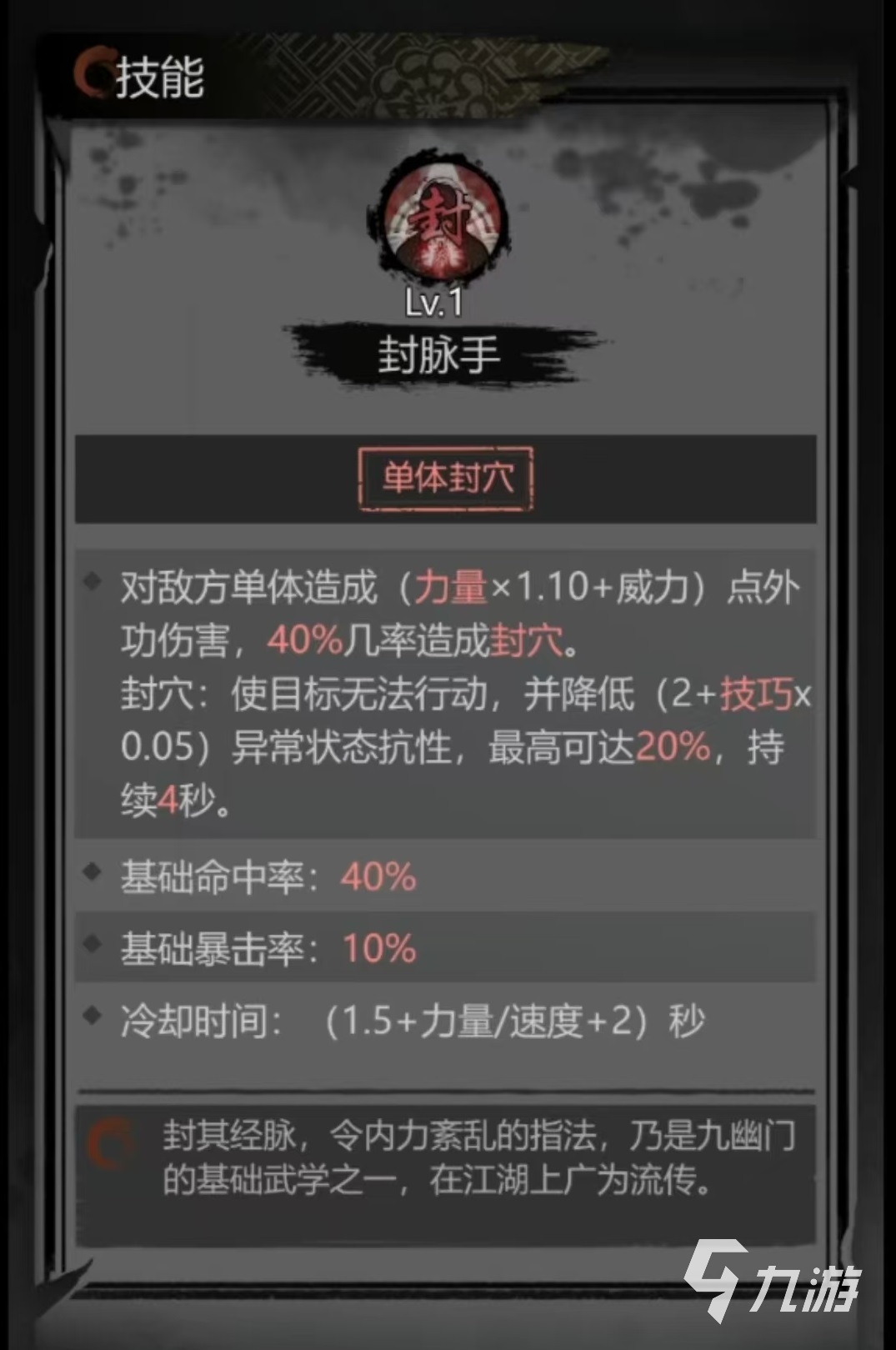 先來看一下劍客本身的技能特點,劍客的戰(zhàn)斗定位是外功輸出,還具有單體封穴的能力,主要戰(zhàn)斗技能有三個,分別是封脈手、迅雷劍和七星劍。封脈手的效果是對敵方單體造成外功傷害,有幾率造成封穴,這個技能的威力是和力量相關(guān),對方被封穴之后,無法行動并降低異常狀態(tài)抵抗能力,最高可以降低20%,持續(xù)4秒鐘。該技能冷卻時間也受到力量和速度的影響,基礎(chǔ)命中率40%,基礎(chǔ)暴擊率10%。