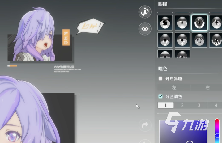 然后就是五官的改變,五官方面的眼睛可以直接從選項(xiàng)里找出,這種眼睛是屬于比較大且方圓類(lèi)型的,可以直接選擇中間的那個(gè)眼睛,然后就是眼睛的顏色,也可以直接選擇紫色,這樣跟發(fā)型是比較搭配的,眉毛的話直接選擇最后一個(gè)選項(xiàng),這樣五官的塑造就大致完成了。
