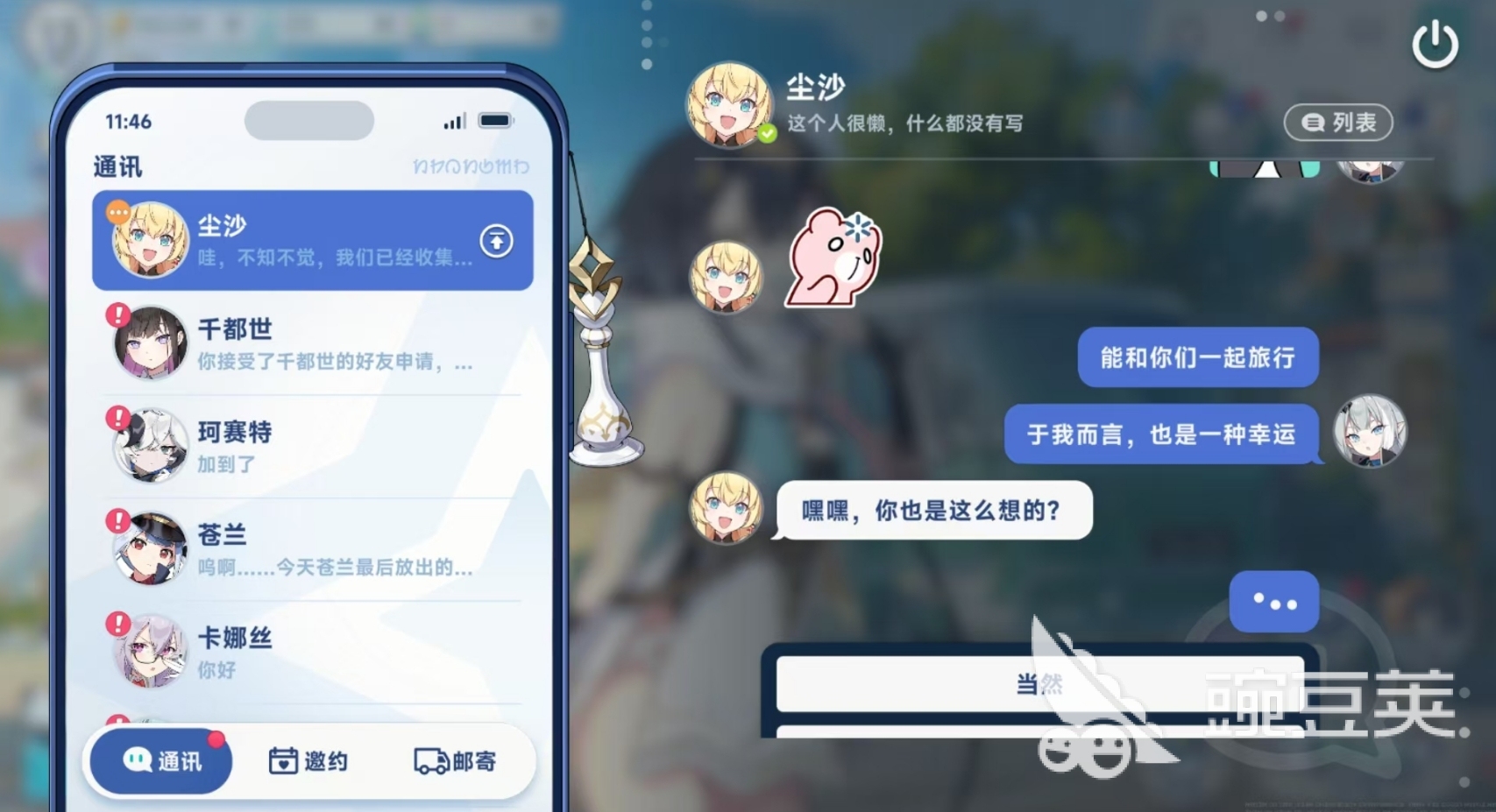 心鏈系統(tǒng)主要由通訊、邀約和郵寄三大功能組成,里邊只會出現(xiàn)玩家已獲得的角色。其中,通訊功能相當于聊天,它可讓各位與任何一名角色進行對話,每階段的對話完成后,還能拿到星之砂獎勵。該功能每天使用的次數(shù)不受任何的限制,各位若是有特別喜歡的角色,可用她們頭像后方的置頂功能,讓她們能排在列表的最上邊,方便自己去查看該角色是否有新的聊天話題。同時,各位在點開各角色的聊天界面后,還可在左上的列表里,去查看自己與角色之前所聊的全部內(nèi)容。