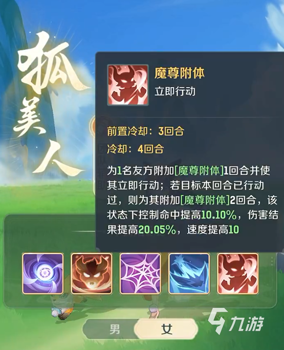 他的“含情脈脈”會讓隊(duì)友們在4個(gè)回合內(nèi),能提升一定的物防,他的“靈狐歸元”能凈化一名隊(duì)友并為其恢復(fù)880的氣血,他的“妖尊降世”會讓一名隊(duì)友提升19%傷害1回合并使其立刻行動(dòng),若本回合已經(jīng)行動(dòng)過,則額外提升590點(diǎn)攻速并讓其傷害提升變?yōu)?回合。