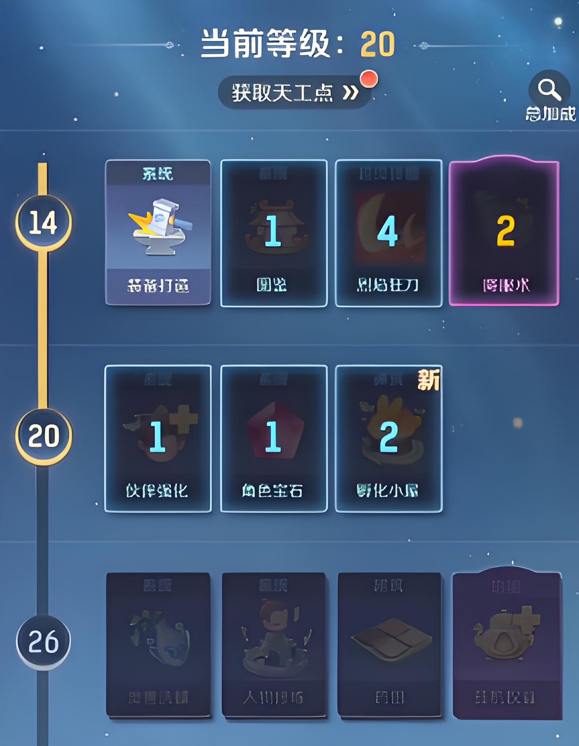 在天工點的獲得上,在達到14點和20點時建議玩家全部解鎖。在這些層級上玩家能解鎖裝備和寶石裝配、靈獸圖鑒、超級技能烈焰狂刀、降魔術(shù)等,在26點時先解鎖掛機玩法和人物修煉,因為掛機玩法能讓玩家每日獲得更多的資源。