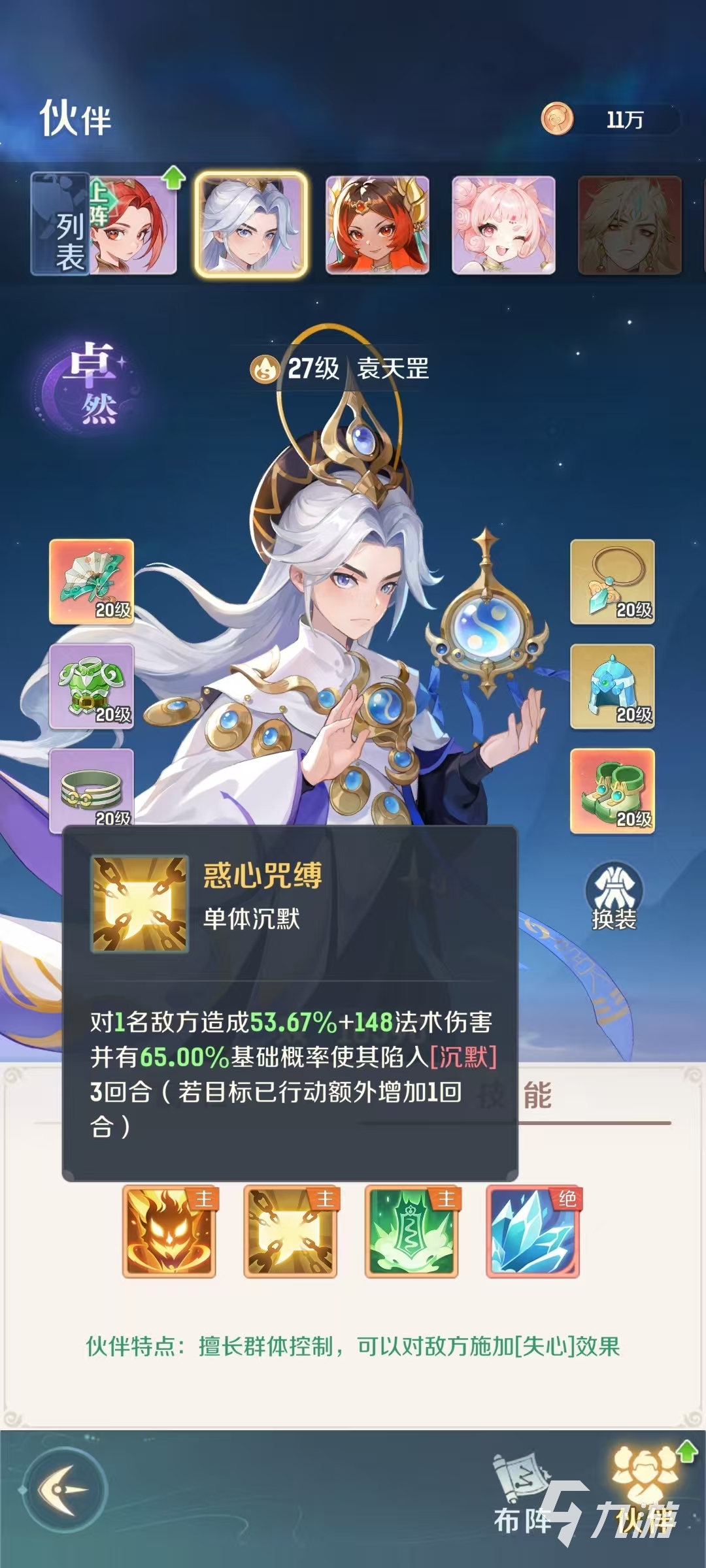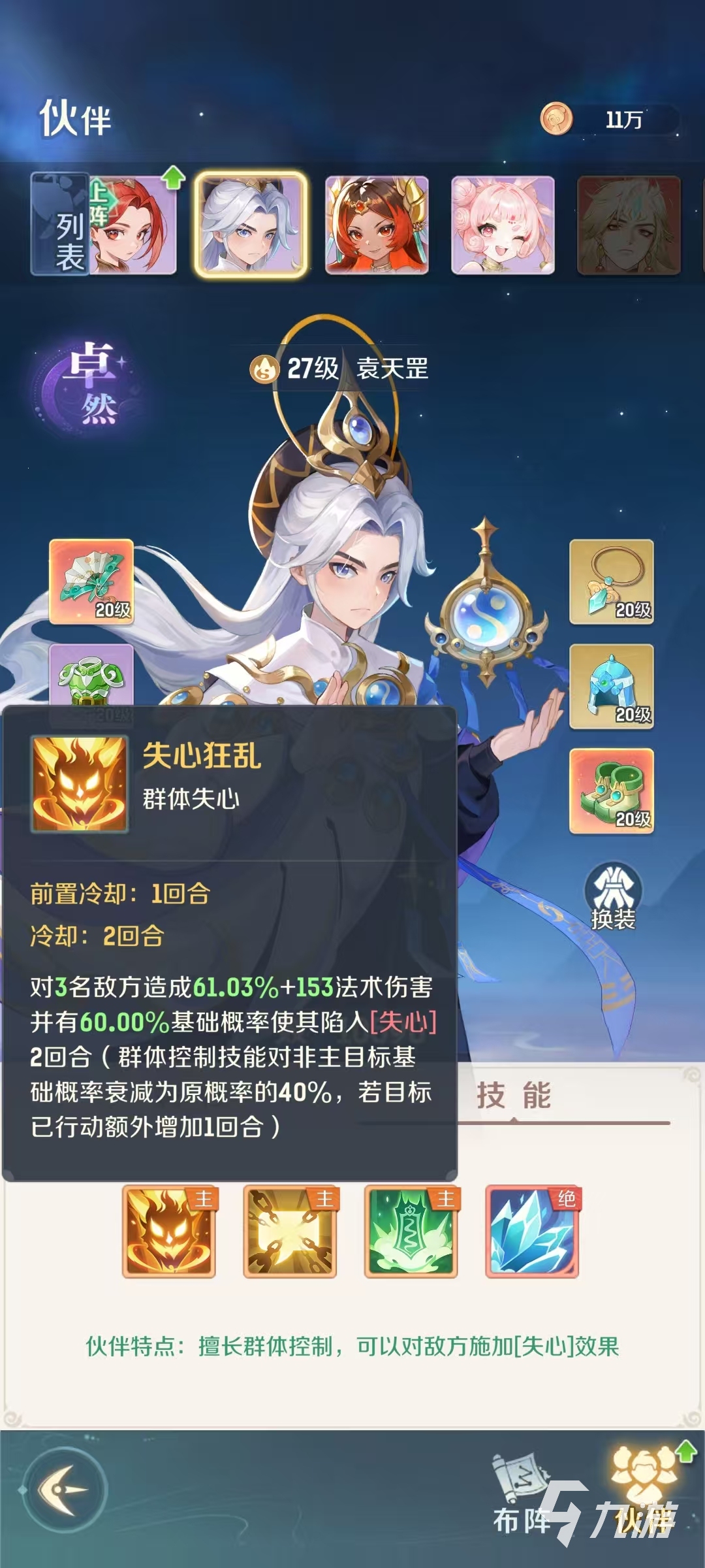 袁天罡的獲取非常簡單,大家跟隨著前期的主線,開服第1天就可以拿到,作為紫色的伙伴,他的技能也比較少,只有三個(gè)主動(dòng)技能和一個(gè)絕技。第1個(gè)技能失心狂亂,需要前置冷卻一回合,使用之后冷卻兩回合。對三個(gè)敵方單位造成法術(shù)傷害后,有60%幾率使其陷入失心狀態(tài),持續(xù)兩回合。這里要注意,群體控制類型的技能,對非主目標(biāo)是有著概率衰減的。所以大家使用時(shí)也要選好主目標(biāo)。