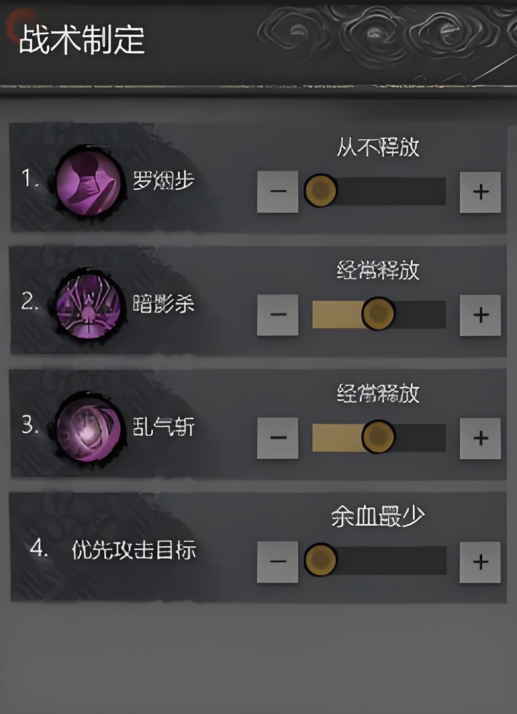 刺客的職業(yè)技能有【羅煙步】、【暗影殺】、【亂氣斬】等。羅煙步技能提高輕功效果和閃避效果,暗影殺技能提高傷害數(shù)值和一定的中毒概率,亂氣斬是提高攻擊速度和攻擊傷害的技能。在后續(xù)的在選擇刺客上陣后還能優(yōu)先針對場上血量較少的目標進行攻擊。