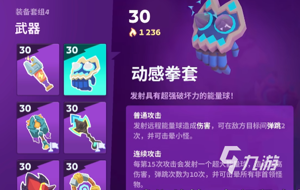 動感拳套會發(fā)射全程能量球造成傷害,可在目標(biāo)之間彈跳2次,碰觸到小怪會將其擊暈,連續(xù)攻擊15次時會發(fā)射一個能造成更高傷害的大能量球,彈跳次數(shù)變?yōu)?0并且可擊暈所有非首領(lǐng)類怪物,它的獲取方式為完成“保護(hù)神殿舞者”任務(wù)。