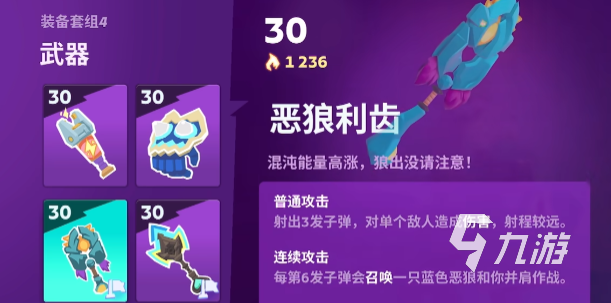 惡狼利齒的普攻會發(fā)射3顆子彈,對單個敵人造成傷害,射程比較遠(yuǎn),發(fā)射第6發(fā)時會召喚出一只藍(lán)色惡狼和我們并肩作戰(zhàn),它的獲取方式為在10級左右,完成第一個成就任務(wù)。