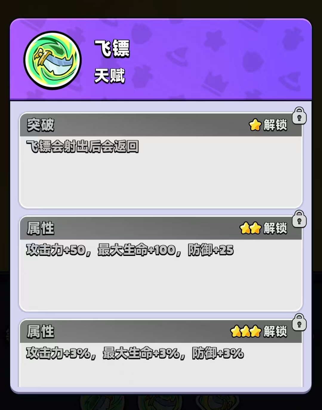 貓刺客的主要技能是飛鏢,可朝最近的敵人發(fā)射出飛鏢。在后續(xù)解鎖更多的天賦之后,飛鏢發(fā)射出去會(huì)返回造成二次傷害,飛鏢的數(shù)量提升,最終傷害提升,擊退效果增強(qiáng),達(dá)到滿星突破,飛鏢的數(shù)量非常多,再加上擊退效果,實(shí)戰(zhàn)強(qiáng)度可觀。光環(huán)能夠降低敵人的風(fēng)元素抗性,這一點(diǎn)在很多風(fēng)系陣容中就非常有用。