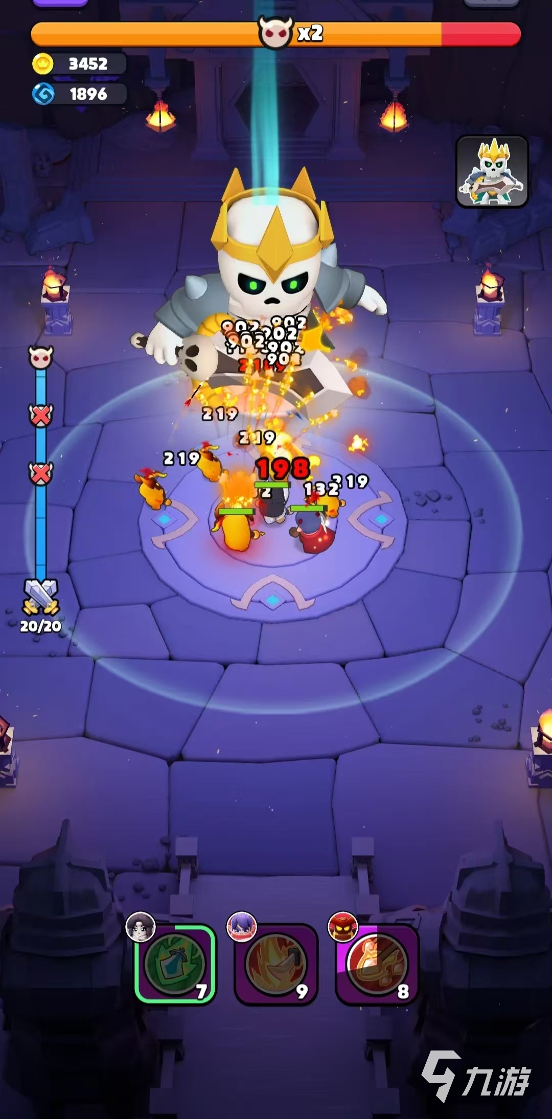第八關(guān)的守關(guān)Boss是暗影之王,其擁有三個(gè)階段,第一是普通形態(tài),會(huì)釋放直線彈幕,走位躲避即可。第二是分身形態(tài),它會(huì)召喚3個(gè)幻影,但是真身會(huì)偶爾閃爍紅光,玩家可以集中攻擊真身。第三個(gè)為狂暴形態(tài),這個(gè)模式Boss技能是全屏AOE+追蹤彈幕,所有小編建議玩家保留大招在此階段爆發(fā)輸出。