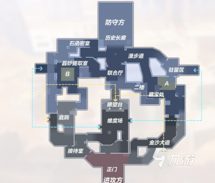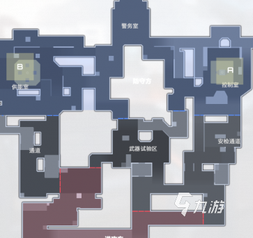 之后是第二張爆破地圖,這張圖叫做空間實(shí)驗(yàn)室,這張圖的話對比小鎮(zhèn)來說就要小很多了,在這張圖中大a點(diǎn)和b點(diǎn)兩個(gè)點(diǎn)位各占了地圖差不多四分之一左右,分布在左下方和右上方,在地圖中間有一個(gè)穿梭廣場作為連接,連接著兩個(gè)點(diǎn)位,不管是進(jìn)攻方的玩家還是防守方的玩家,想要以最快速度轉(zhuǎn)點(diǎn)的話,那都需要通過這兩個(gè)點(diǎn)位去轉(zhuǎn)點(diǎn),不過總的看下來這張圖屬于是一張防守方的優(yōu)勢地圖,因?yàn)榉朗胤降竭_(dá)點(diǎn)位的路程總的來說是要短一些的。