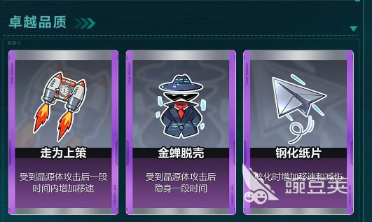 接著也可以看一下卓越品質(zhì)的超炫皮卡,那也是實(shí)用掛。走為上策就比較適合在打不過(guò)要撤的時(shí)候,只要是被晶源體攻擊到那接下來(lái)一段時(shí)間就可以讓移動(dòng)速度變得更快一些。還有比較出色的金蟬脫殼,一旦被打了之后就會(huì)進(jìn)入到隱身的狀態(tài),不管是躲起來(lái)等待隊(duì)友支援,又或者是直接繞到后面去偷人都是比較好用的。還有鋼化紙片,這就是在懸化時(shí)候要給加成減傷,還有移動(dòng)速度全部都可以一起上漲。