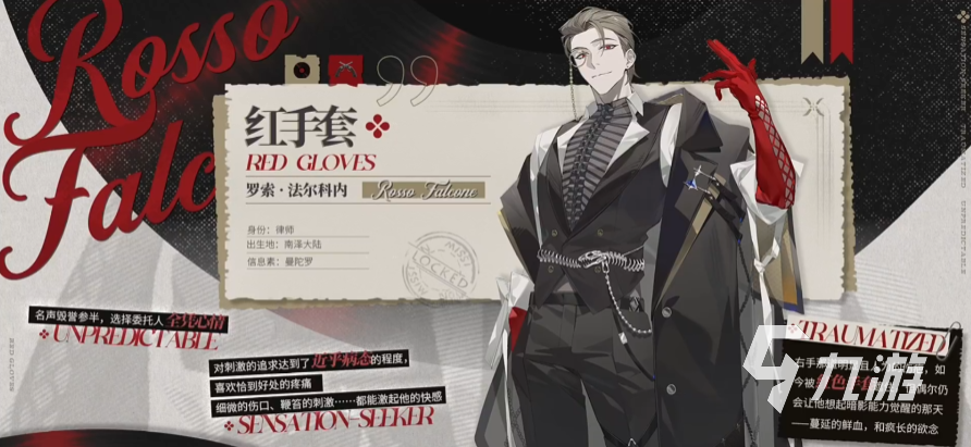 這個角色的身份設定也非常的正經(jīng),是一名律師,南澤大陸是他的居住地,曼陀羅是他喜歡的信息素,穿衣風格就是根據(jù)曼陀羅來的,看似正經(jīng),其實充滿了危險的因素,他的愛好也是比較小眾的。