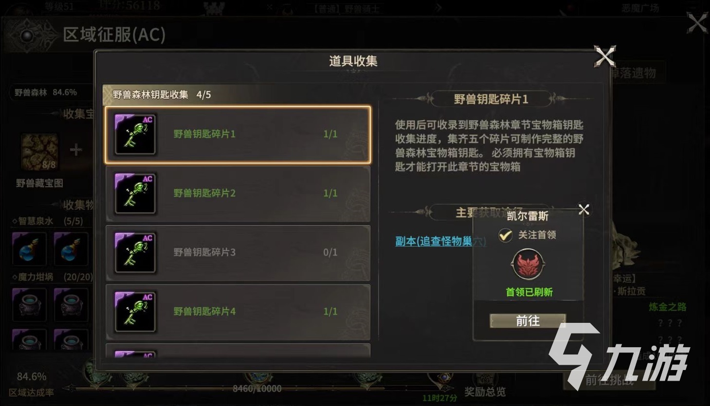 在野獸森林區(qū)域中,對應的寶物收集系統(tǒng)是野獸寶藏地圖,藏寶圖碎片記錄了地圖中的寶物箱位置以及內(nèi)容信息,大家在使用之后,會記錄到該區(qū)域的藏寶圖搜集進度中。集齊8塊碎片之后,就可以解讀出地圖中寶物箱具體位置,然后前往指定地點采集就能夠獲得最終寶物箱。有了寶物箱之后,還需要有對應的鑰匙。野獸森林區(qū)域?qū)氖且矮F鑰匙,鑰匙碎片也是記錄到收集環(huán)節(jié)中的。集齊5塊碎片后可以合成完整鑰匙,需要持有該鑰匙,才可以開啟對應章節(jié)的寶物箱。在大家集齊所有的必要材料之后,點擊前往按鈕就可以定位隱藏寶箱并且開啟。