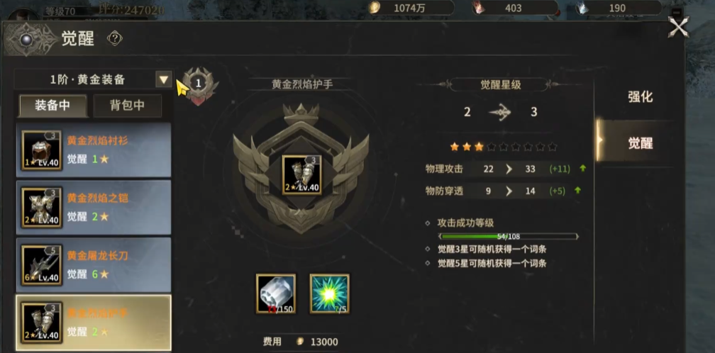 每次對(duì)黃金裝備進(jìn)行覺(jué)醒,都能增加覺(jué)醒的基礎(chǔ)屬性,且每個(gè)裝備覺(jué)醒等級(jí)到1/3/5星時(shí),能獲得1個(gè)屬性詞條,詞條有獨(dú)特的屬性加成;不同職業(yè)可選擇更加合適的詞條去使用,比如增加攻擊力,防御力提升,暴擊率提高等。